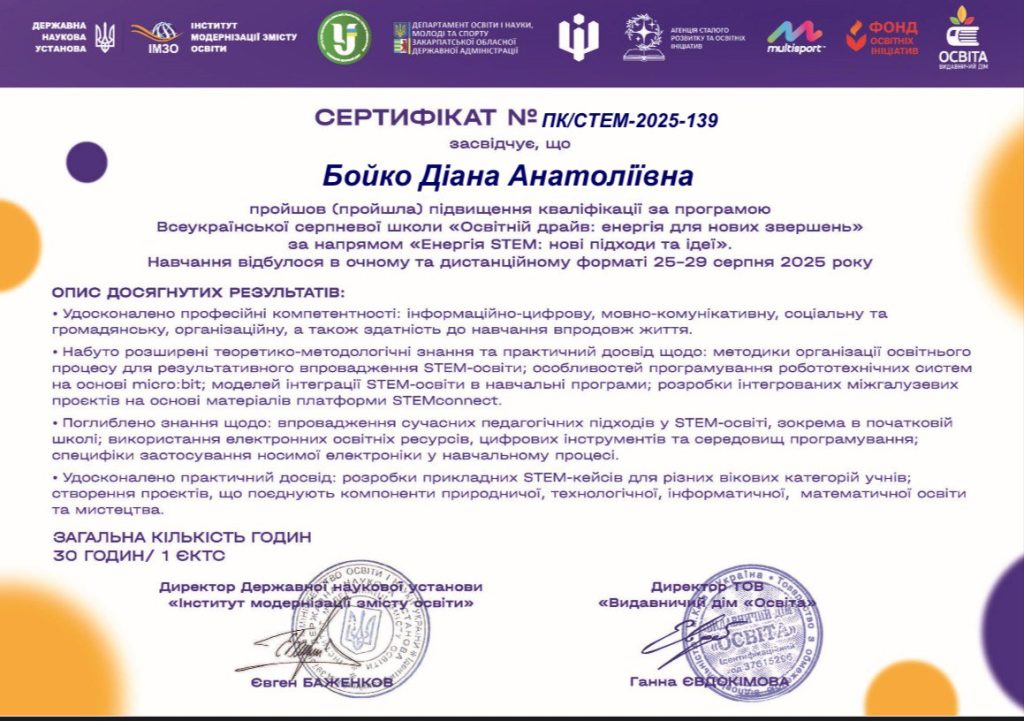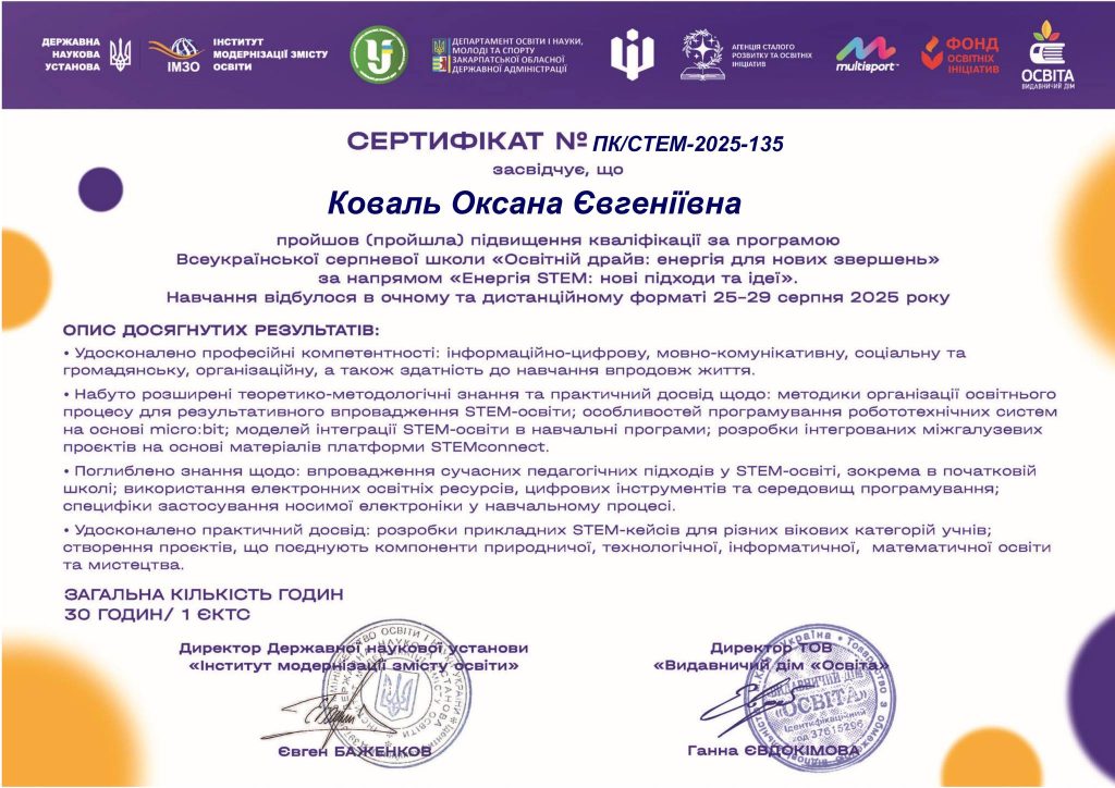 Під час навчання було удосконалено професійні компетентності, здобуто нові знання про сучасні педагогічні підходи в STEM-освіті, а також отримано цінний практичний досвід щодо інтеграції міжгалузевих проєктів, використання інноваційних освітніх ресурсів і створення прикладних STEM-кейсів.
