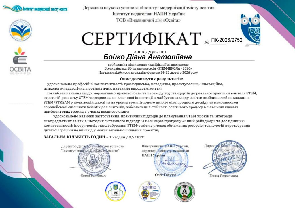 Щиро вдячні організаторам 18-ї Всеукраїнської зимової сесії «#WEB_STEM_ШКОЛА_2026» (24-25 лютого 2026 року) за створення надзвичайно надихаючого простору для діалогу, обміну ідеями та пошуку практичних рішень для майбутнього STEM-освіти.
